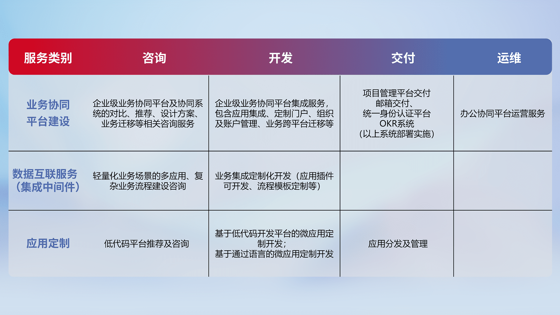 针对钉钉、、、、企微、、IDaas等平台级产品提供产品的规划、、方案、、、交付、、定制化开发等服务,,实现如统一协同办公、、、智能客户服务、、混合会议管理、、、智能数据查询、、、、等业务场景,,实现数字化转型。。。
