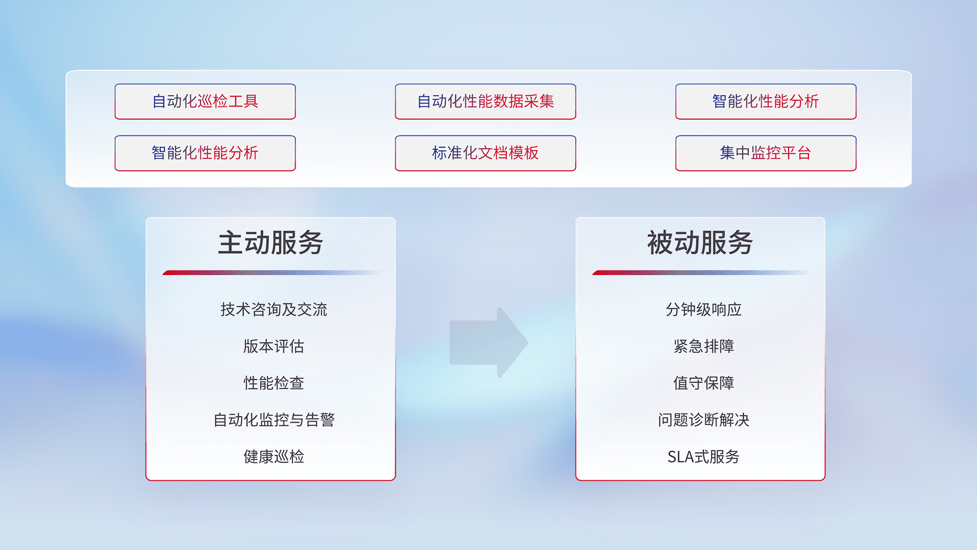 智能化工具和标准化文档,,保障服务质量,,,提供主动服务(包含技术咨询、、版本评估、、、性能检查、、自动化监控与告警、、、健康巡检)和被动服务包含(分钟级响应、、、紧急排障、、值守保障、、、问题诊断解决、、、SLA服务)。。