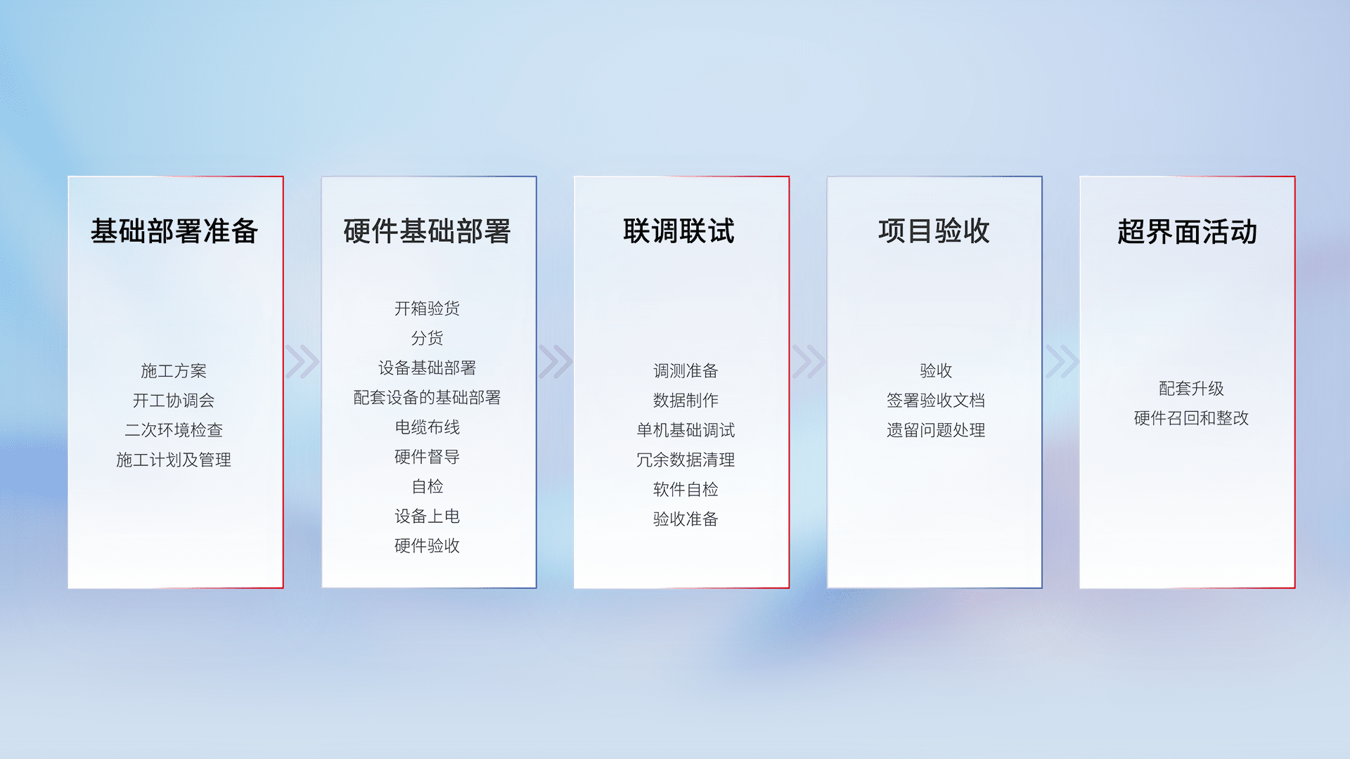 从基础部署准备、、、硬件基础部署、、联调联试、、、、项目验收、、、、越界面活动的全过程可追溯,,,保证施工质量和进度。。。
